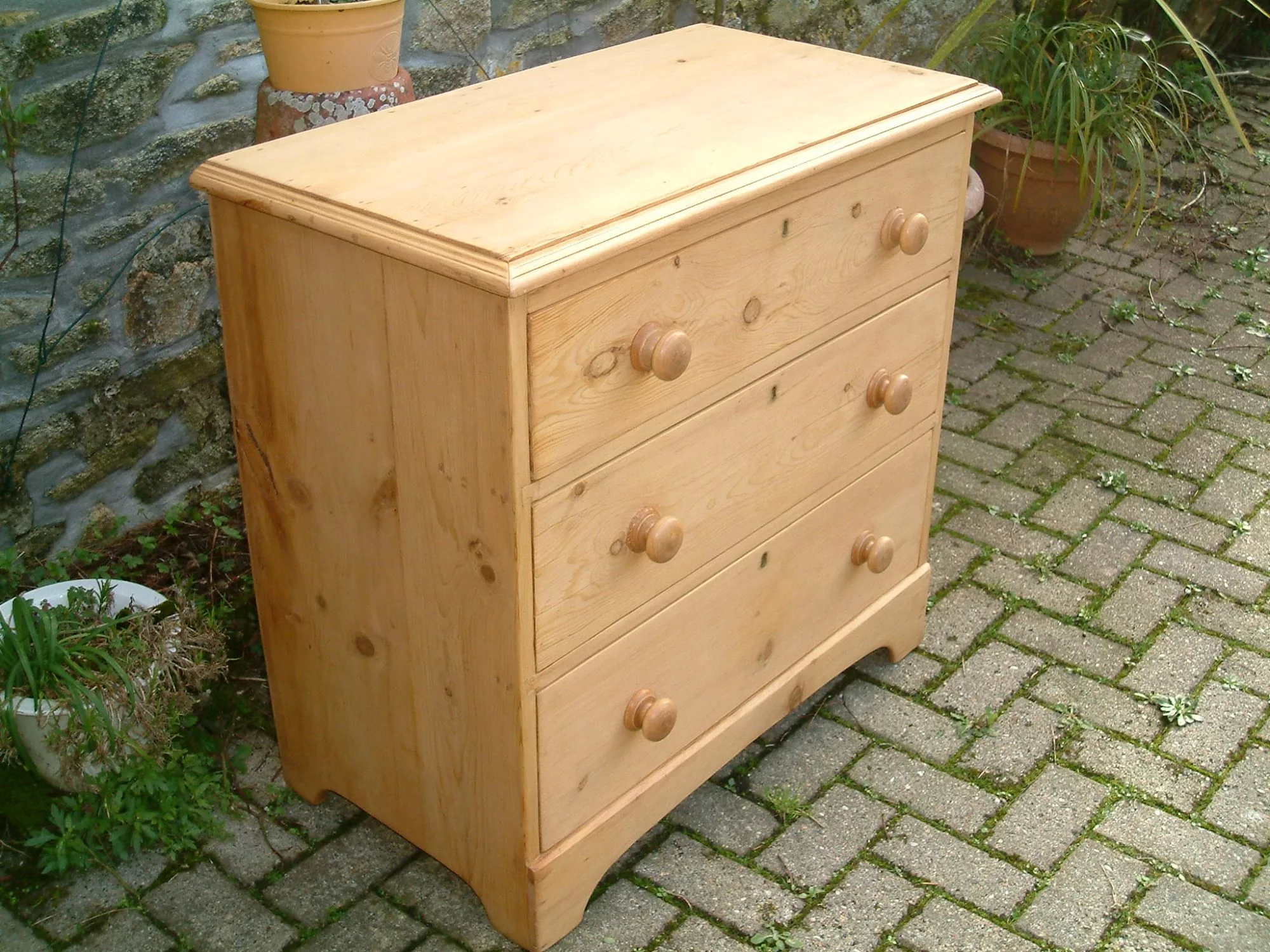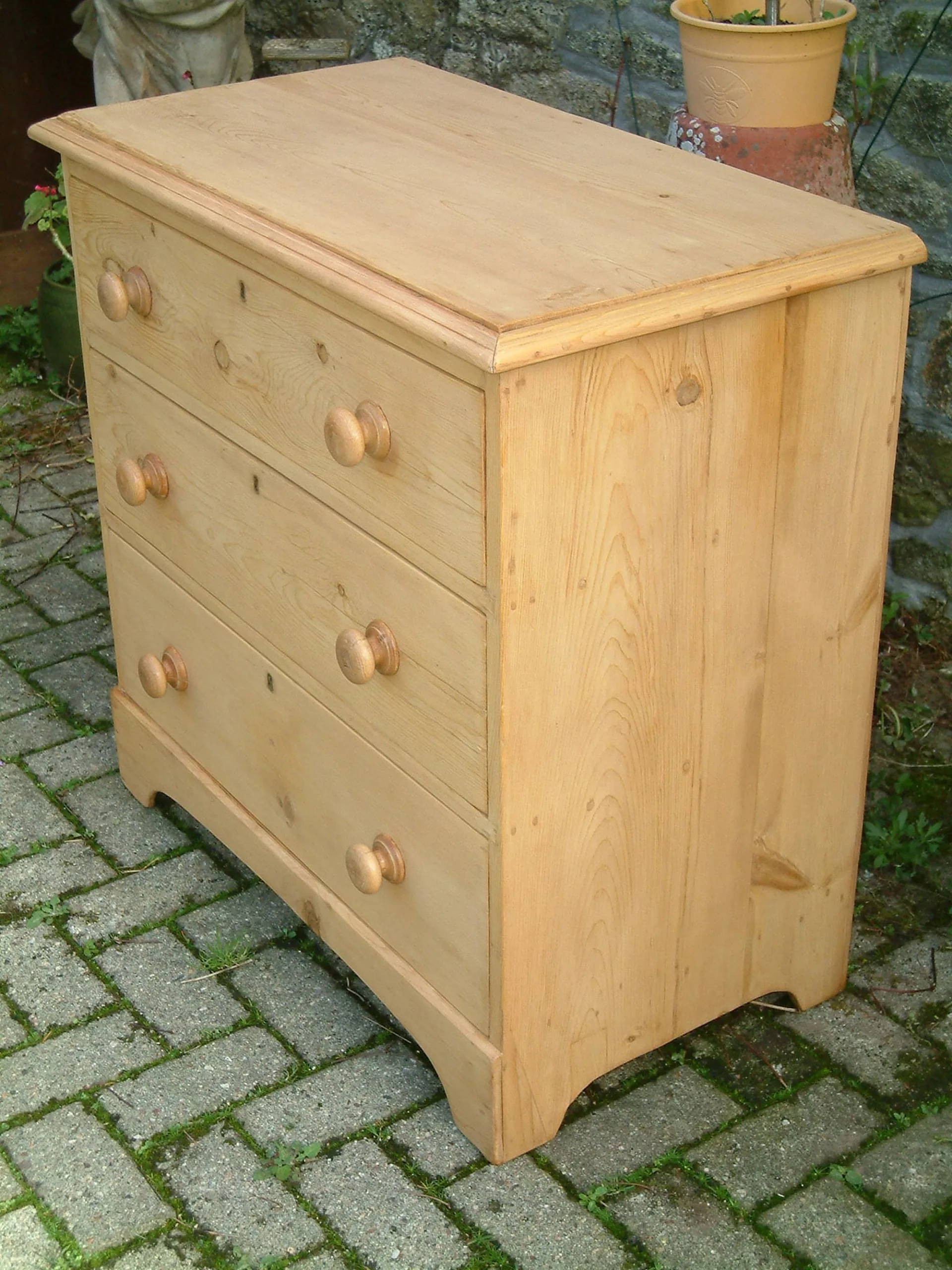 A fine, restored Victorian 3 drawer chest, on shaped sides and shaped front plinth. Drawer runners and bearers restored, so drawers glide easily in their recesses. Drawers with all round dovetail construction and timber bases. Original knobs and escutcheons. Wax finish. Fine panelled back. An excellent old pine chest.