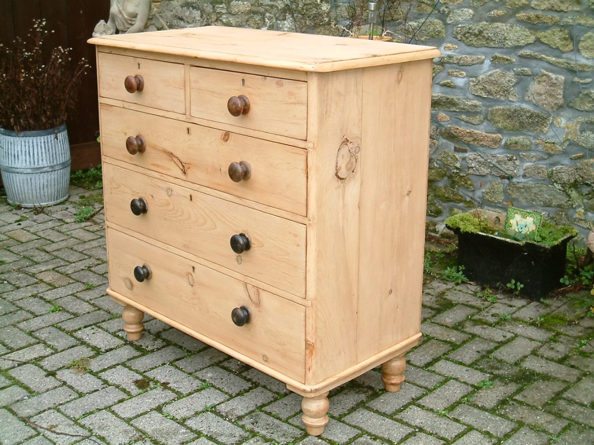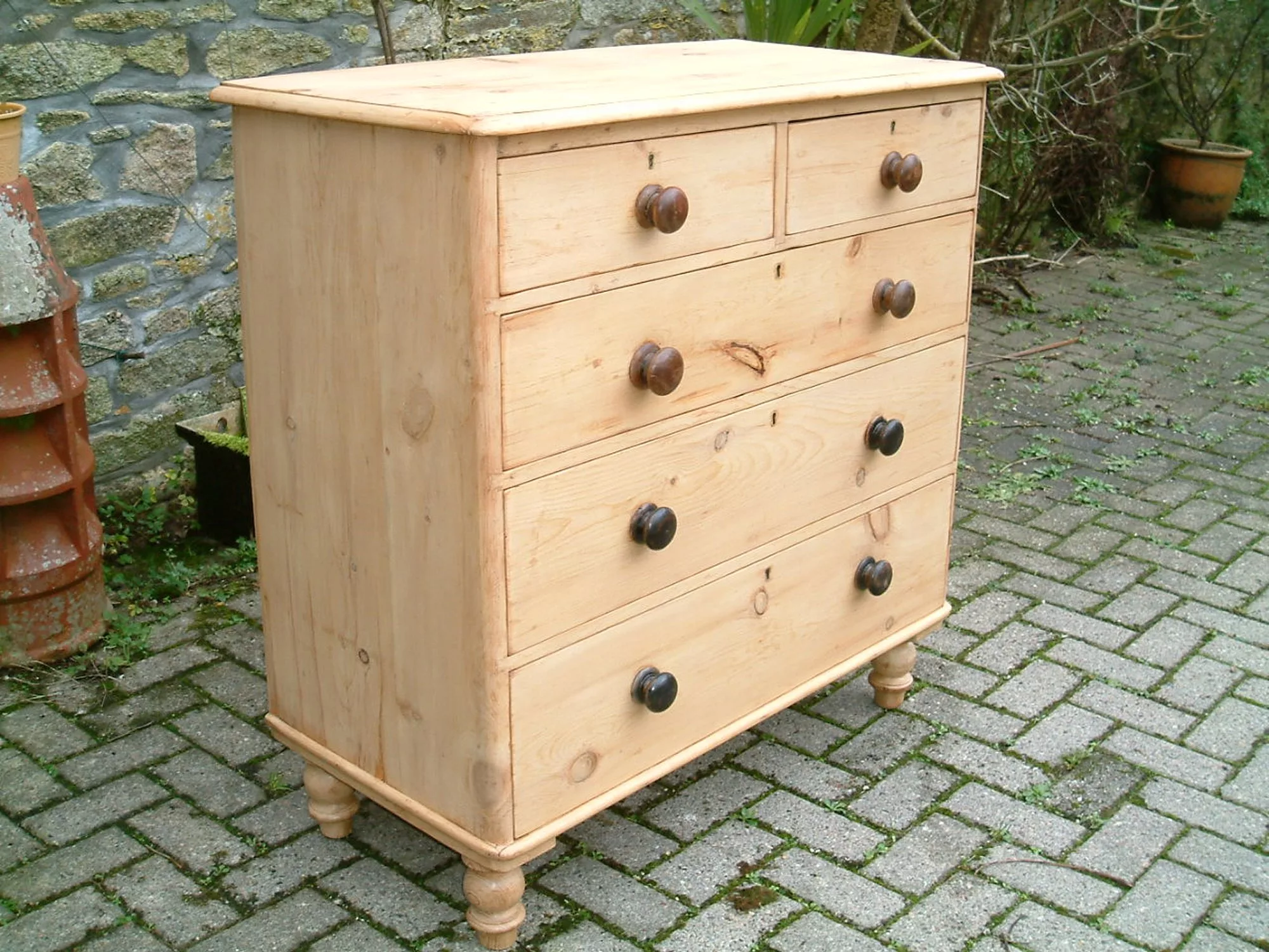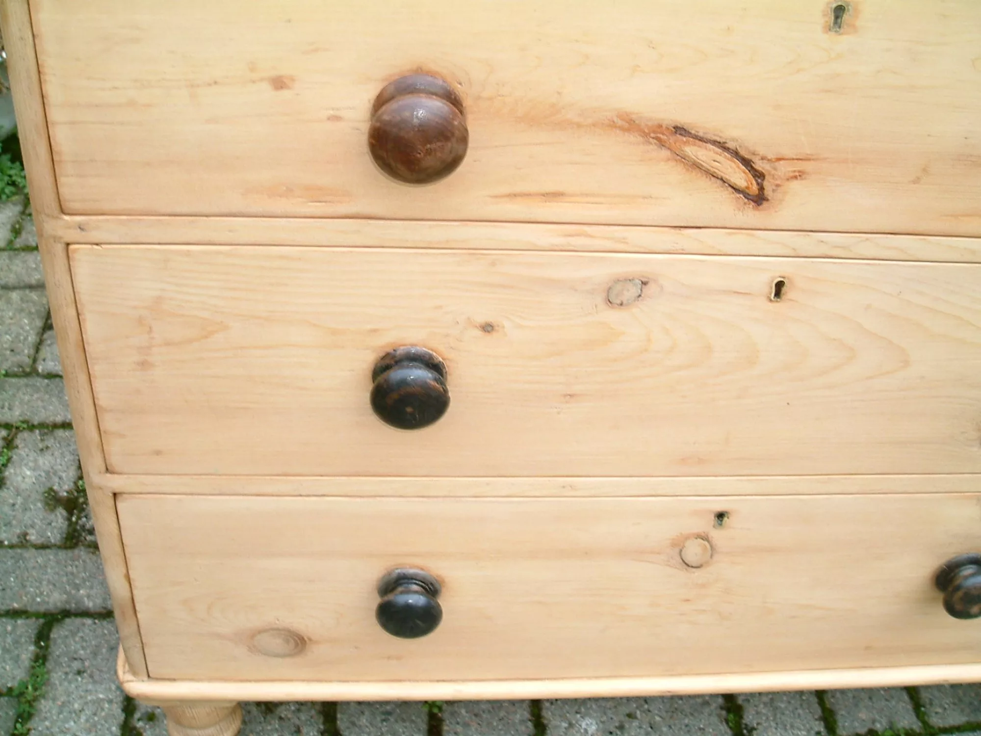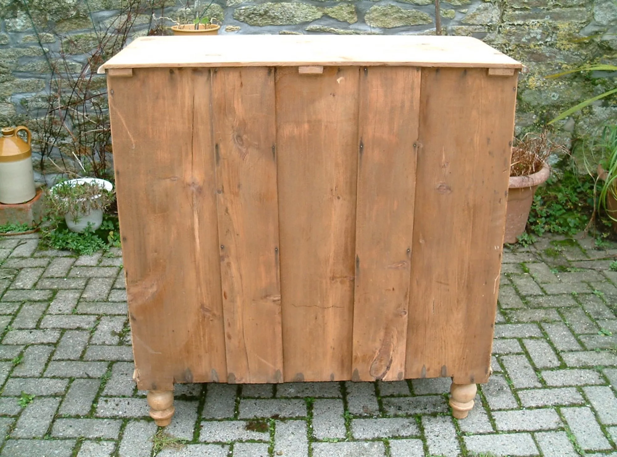 A beautiful, restored, Mid-Victorian pine chest of drawers, on original turned supports. Drawer runners and bearers restored, so drawers glide easily in their recesses. Drawers with all round dovetail construction and timber bases. Original knobs and escutcheons. Fine panelled back. Wax finish. An excellent old pine chest.
