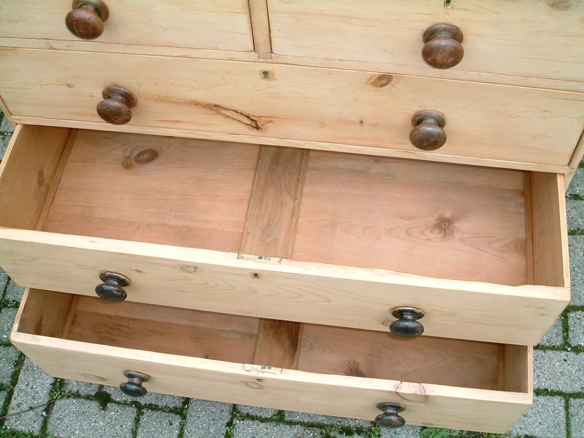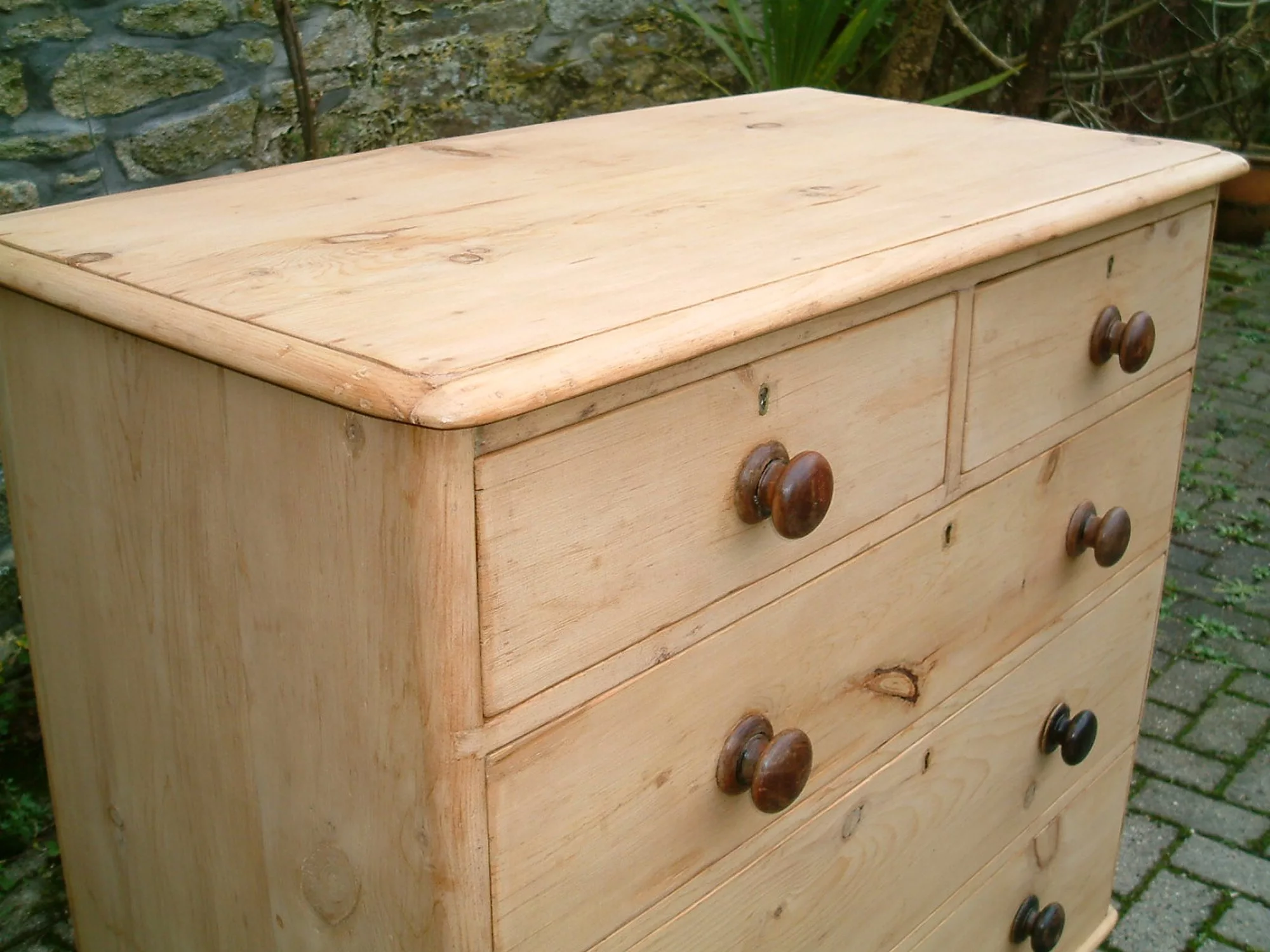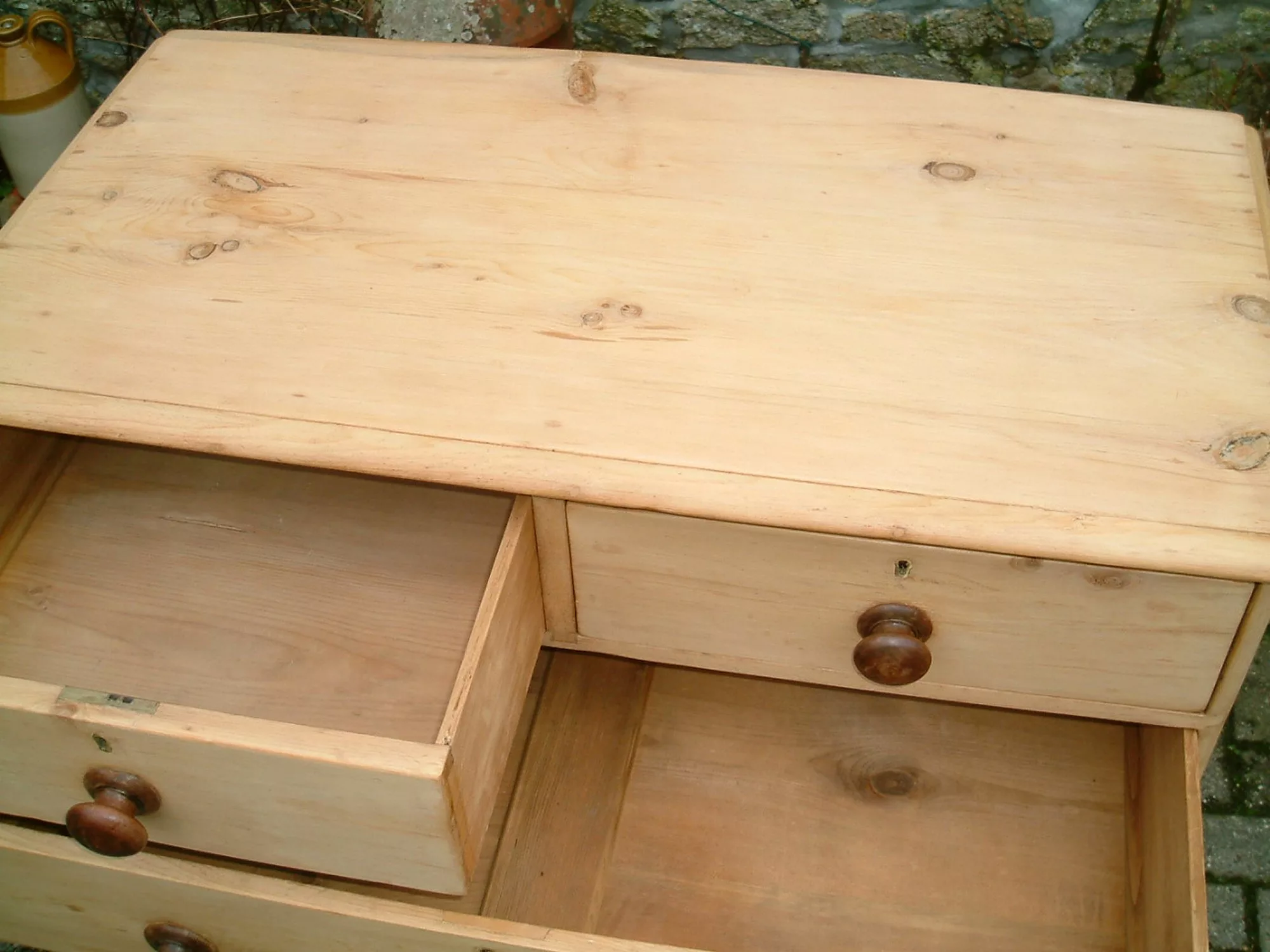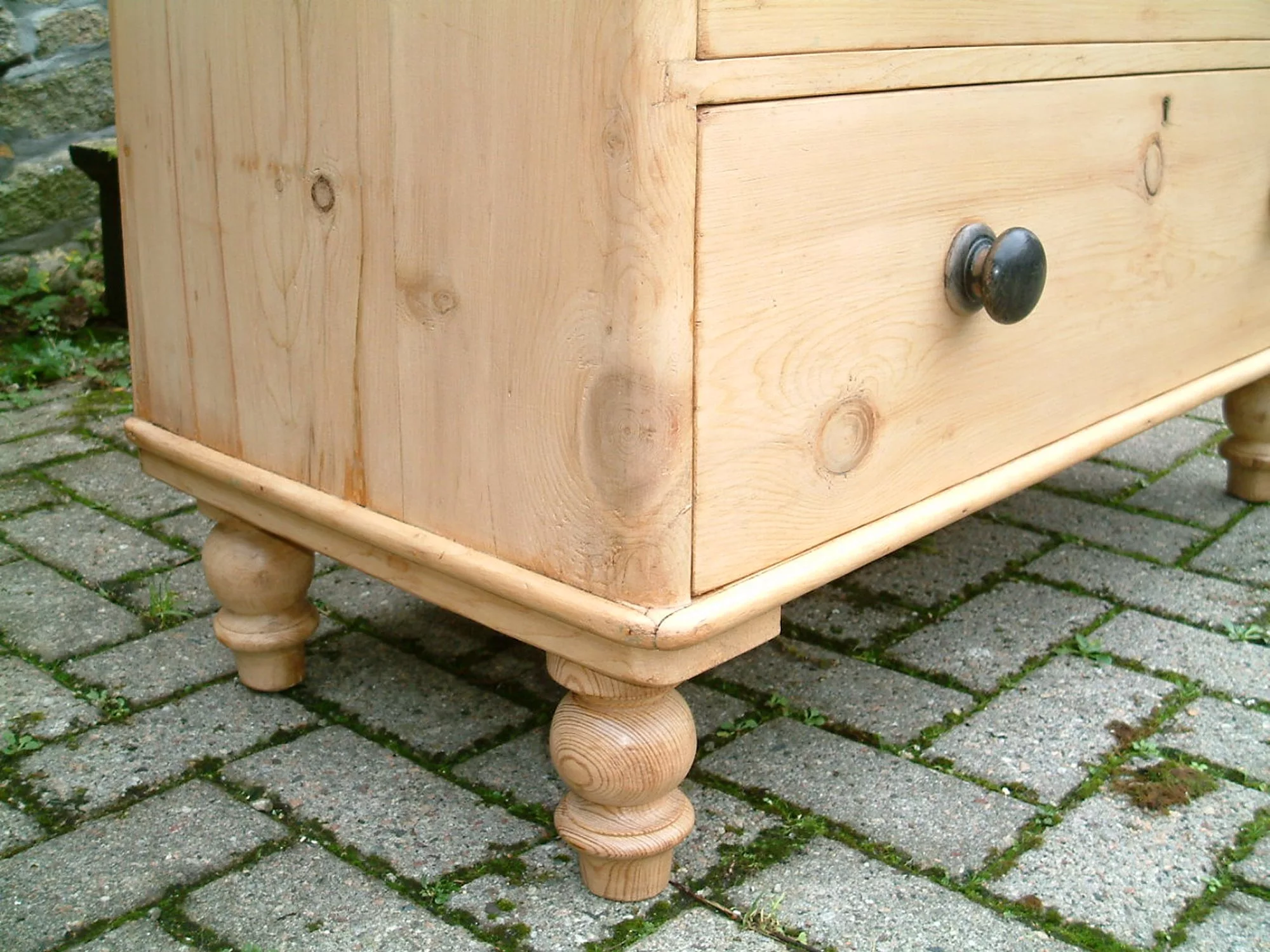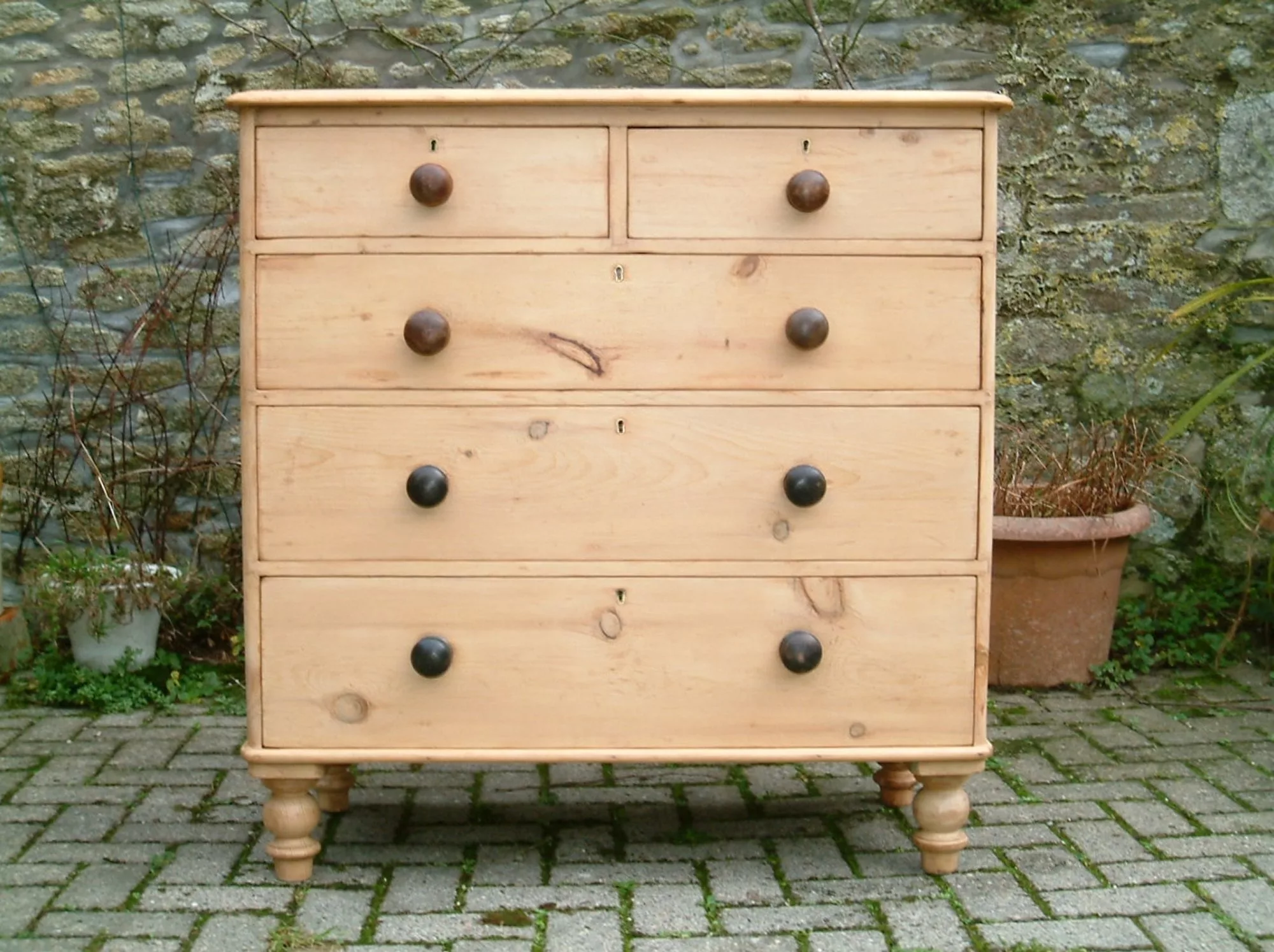 A beautiful, restored, Mid-Victorian pine chest of drawers, on original turned supports. Drawer runners and bearers restored, so drawers glide easily in their recesses. Drawers with all round dovetail construction and timber bases. Original knobs and escutcheons. Fine panelled back. Wax finish. An excellent old pine chest.