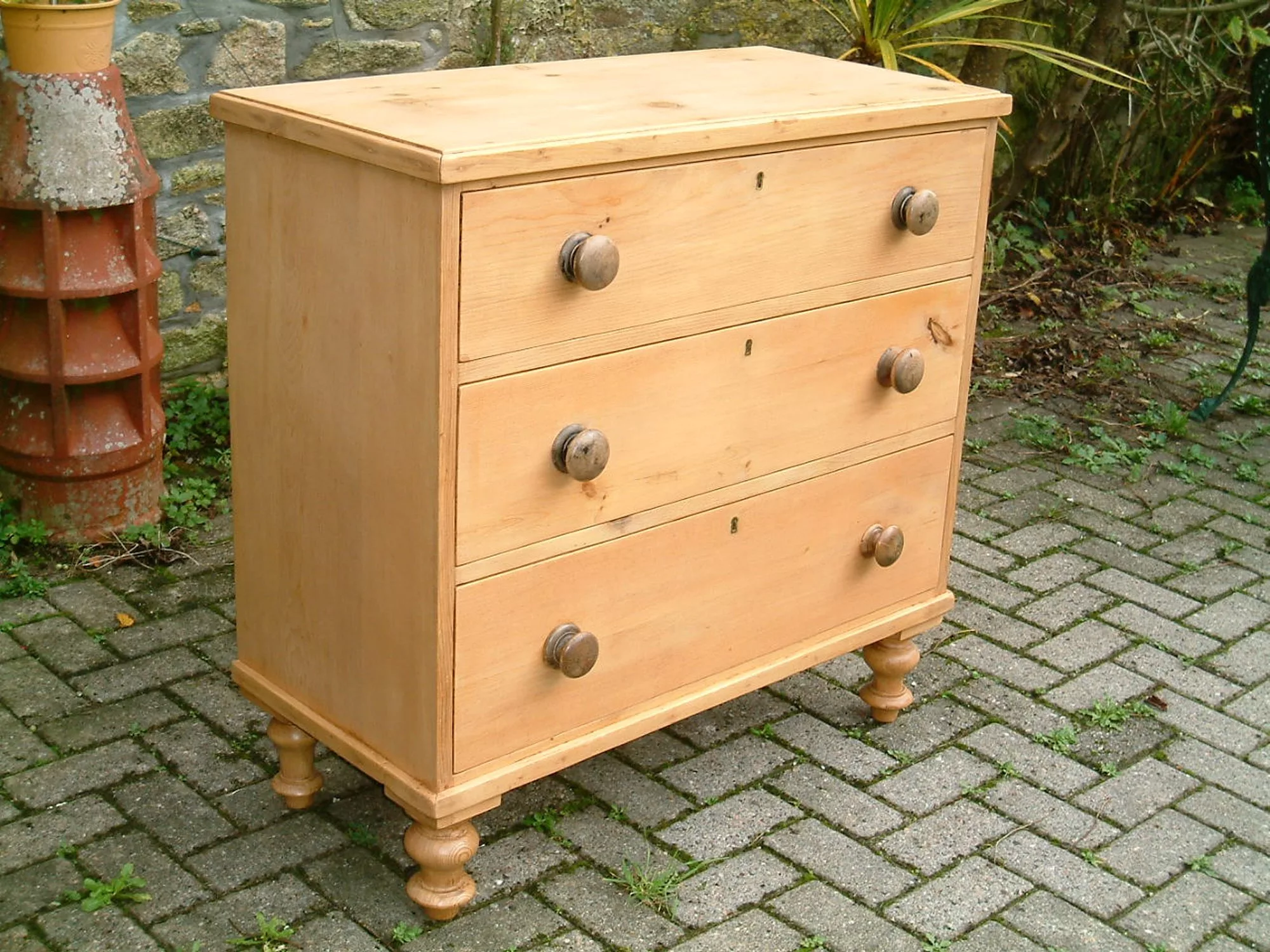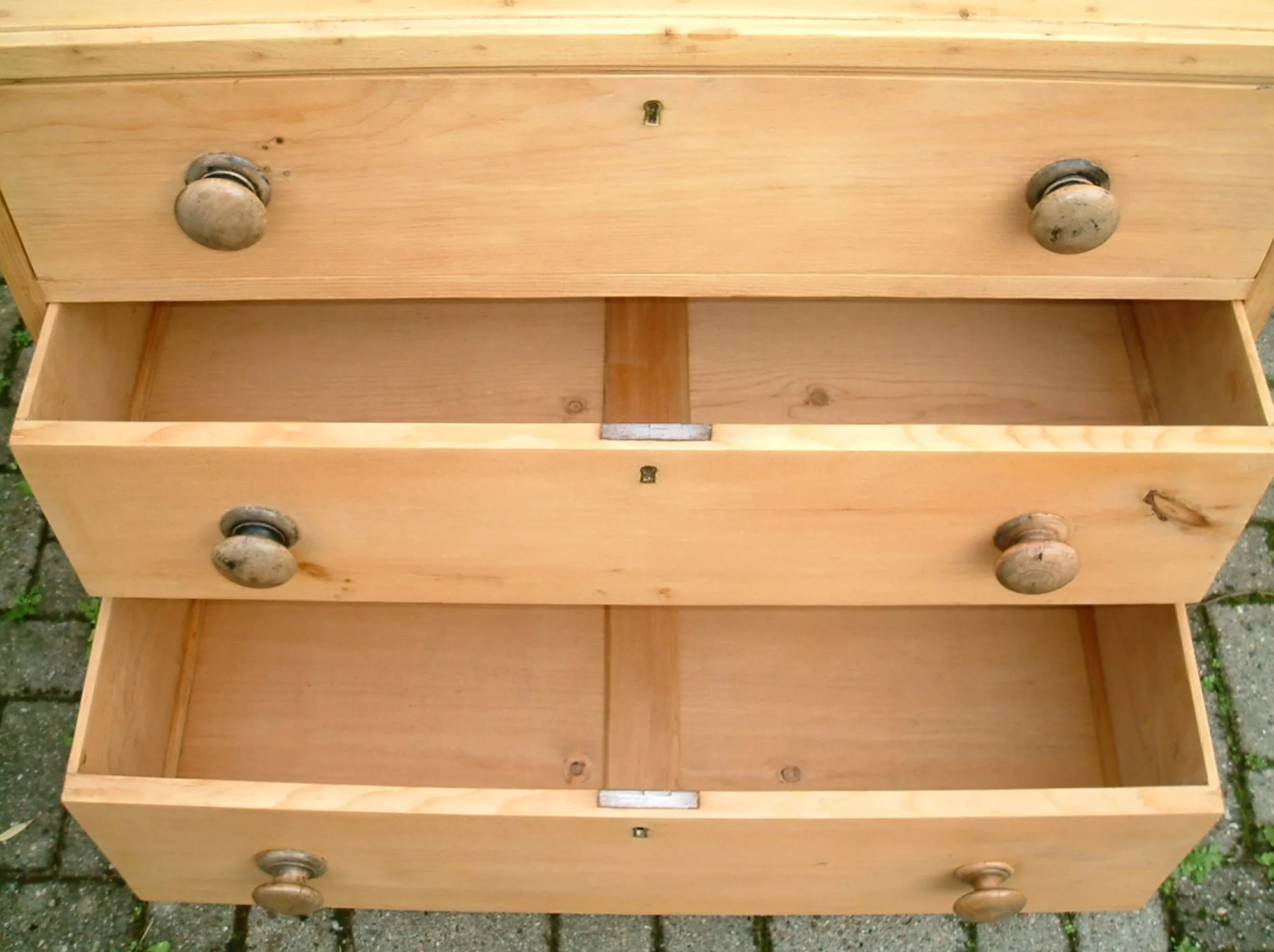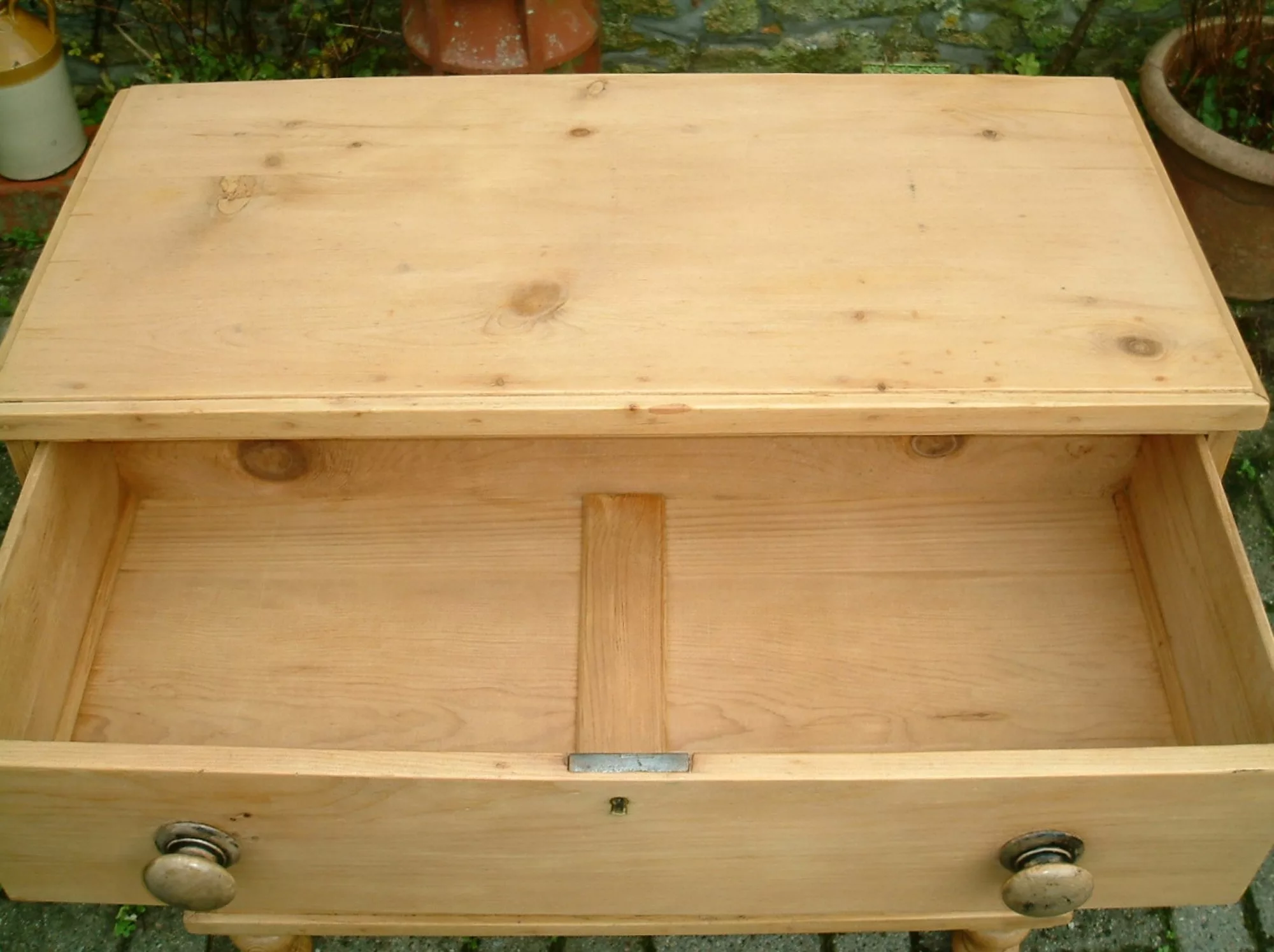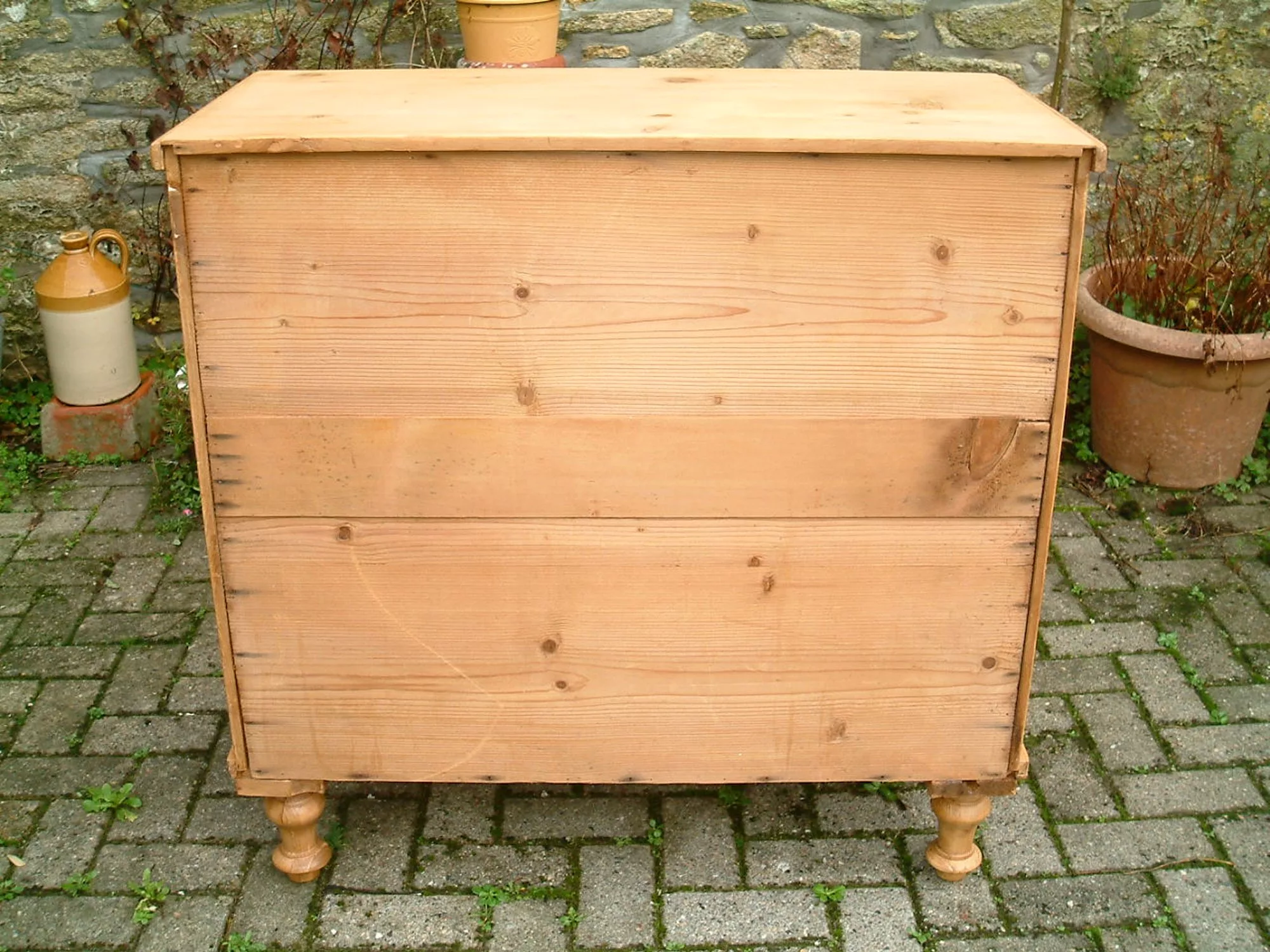 A beautiful, sturdy Early Victorian, pine chest of drawers on tall turned feet. Drawers with all round dovetail construction and timber bases. Replaced drawer bearers and runners where necessary, so drawers glide easily in their recesses. original escutcheons and knobs. Excellent panelled back. Wax finish. A superb old pine chest.