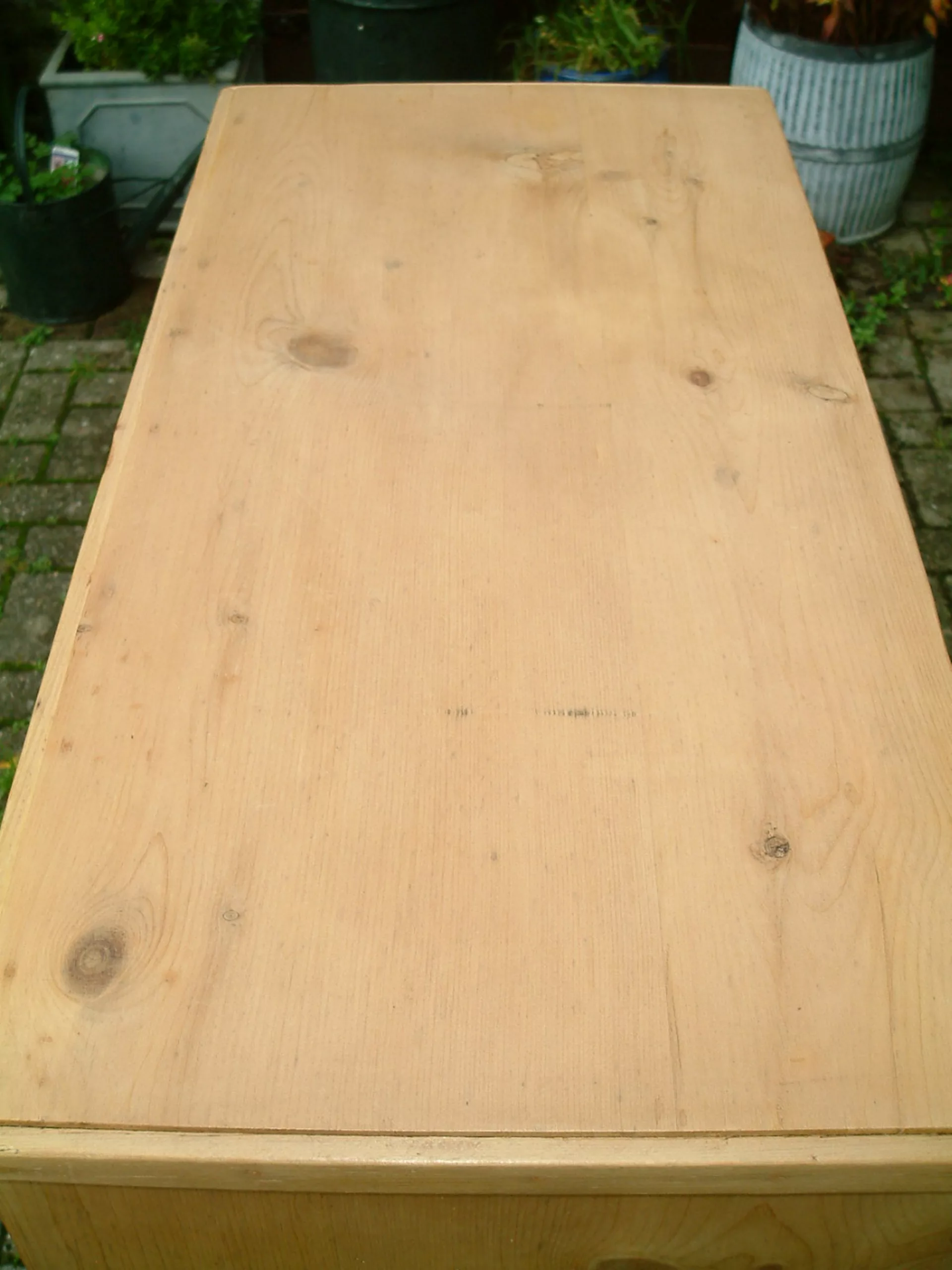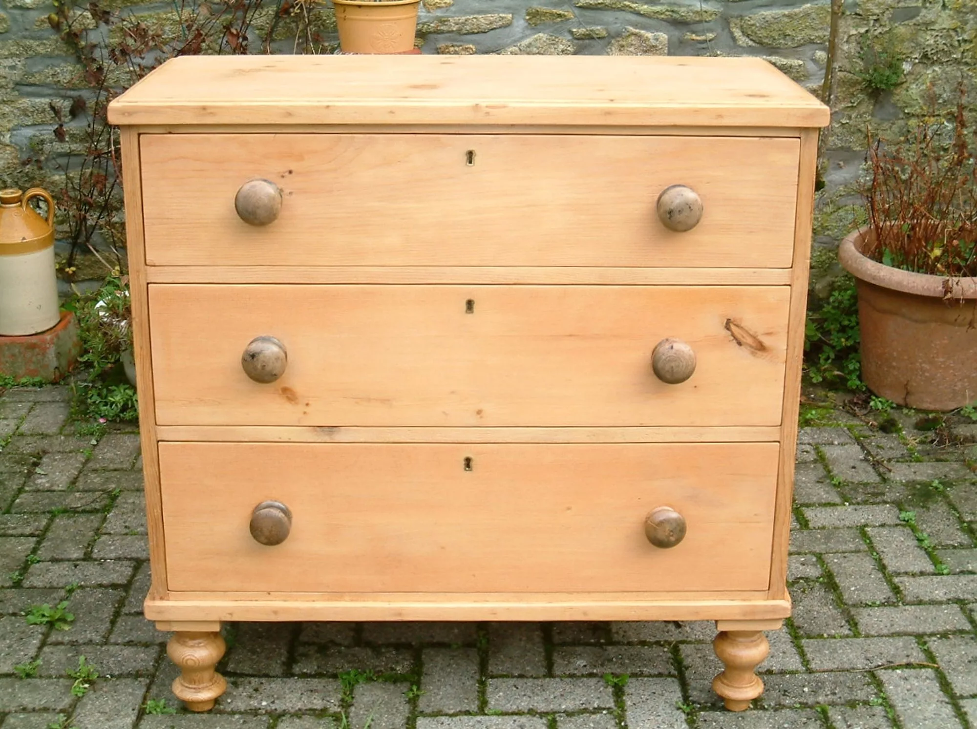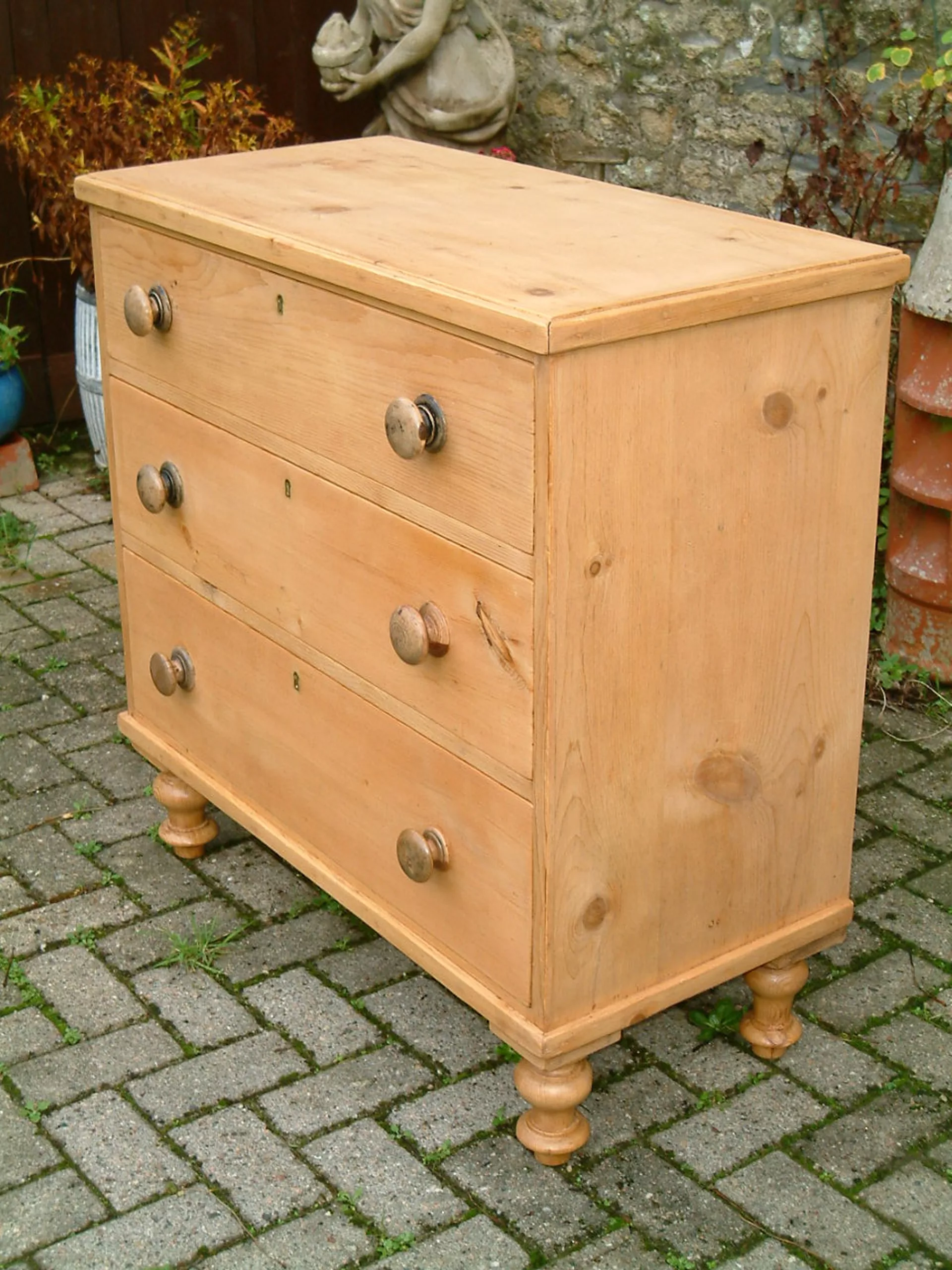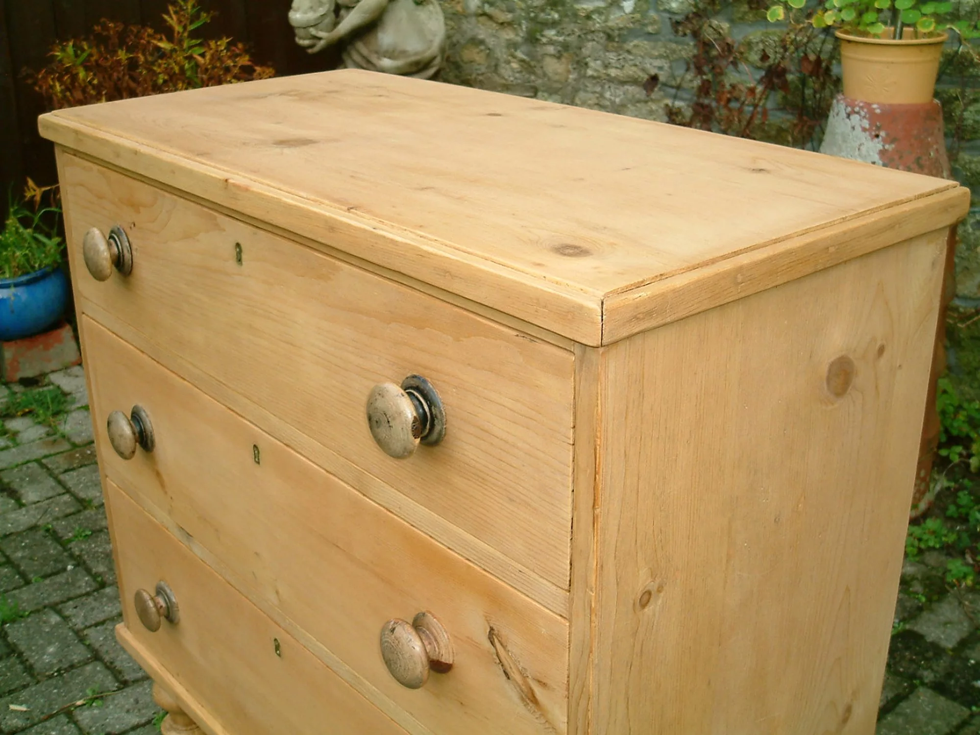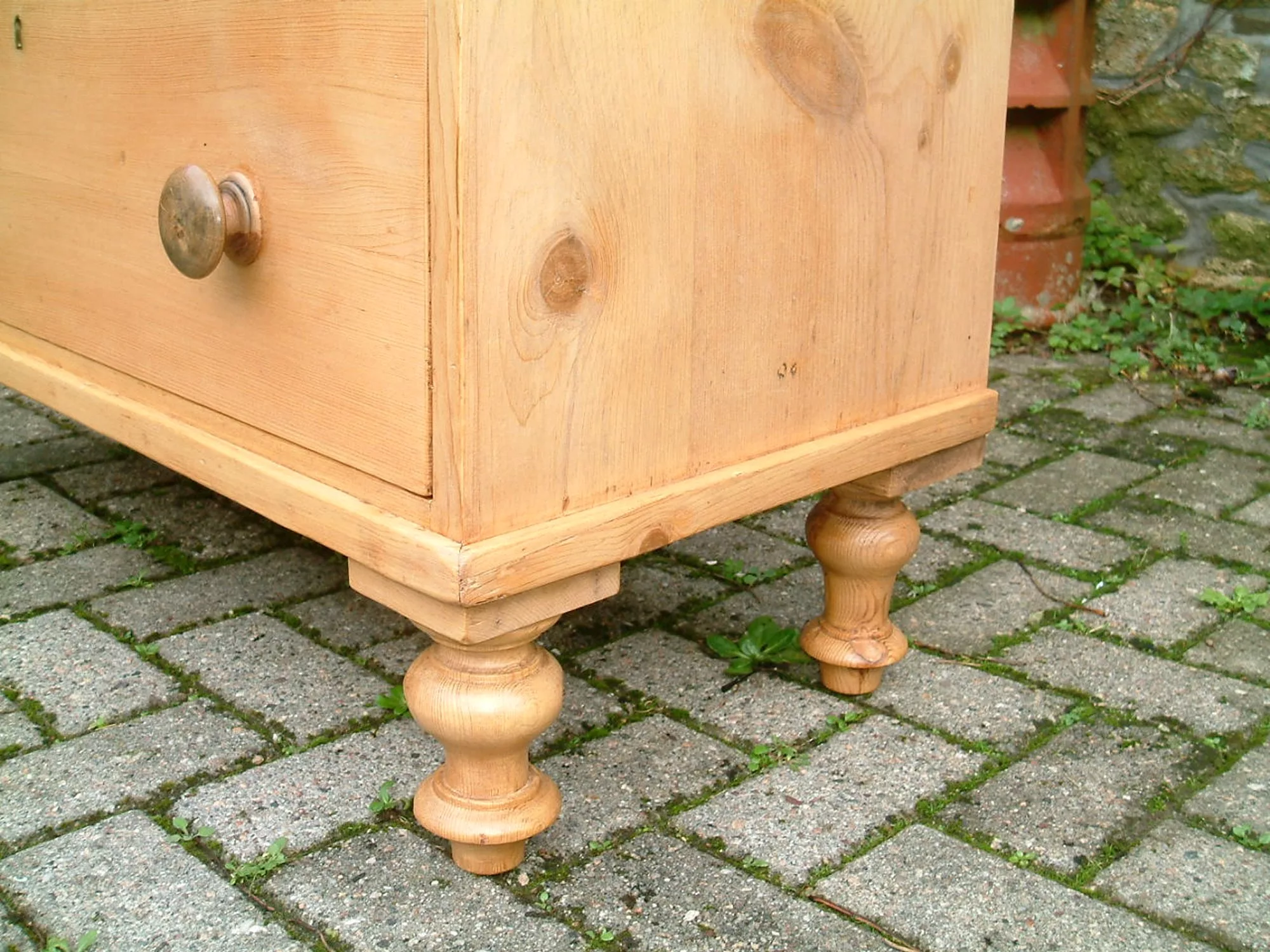 A beautiful, sturdy Early Victorian, pine chest of drawers on tall turned feet. Drawers with all round dovetail construction and timber bases. Replaced drawer bearers and runners where necessary, so drawers glide easily in their recesses. original escutcheons and knobs. Excellent panelled back. Wax finish. A superb old pine chest.