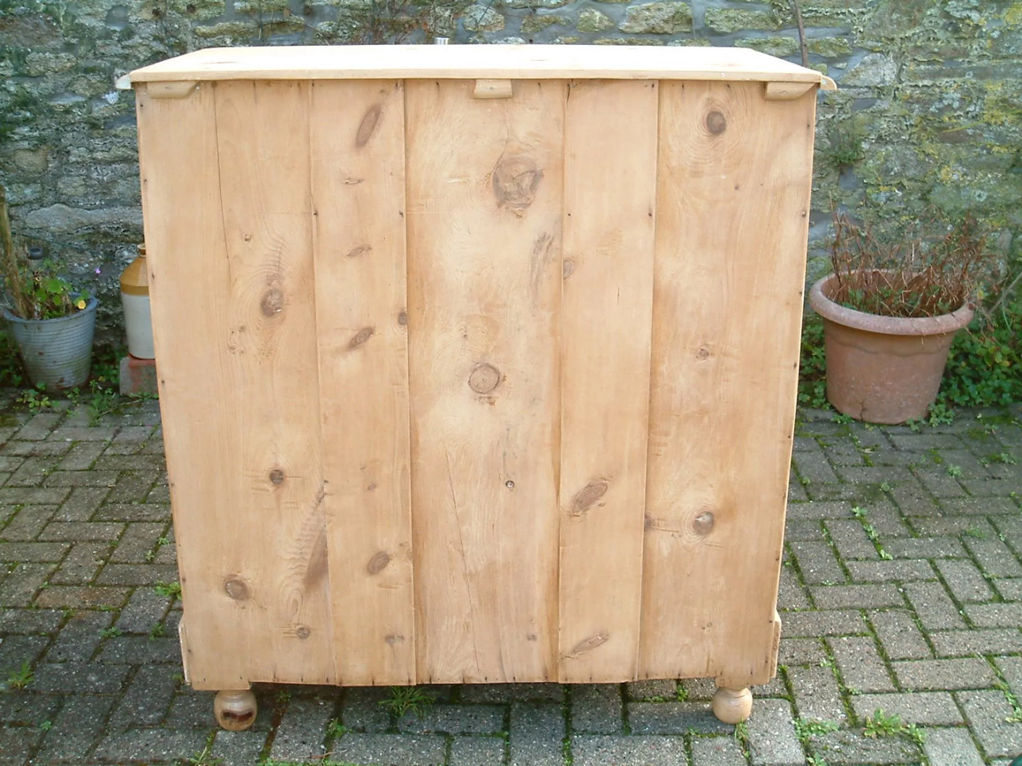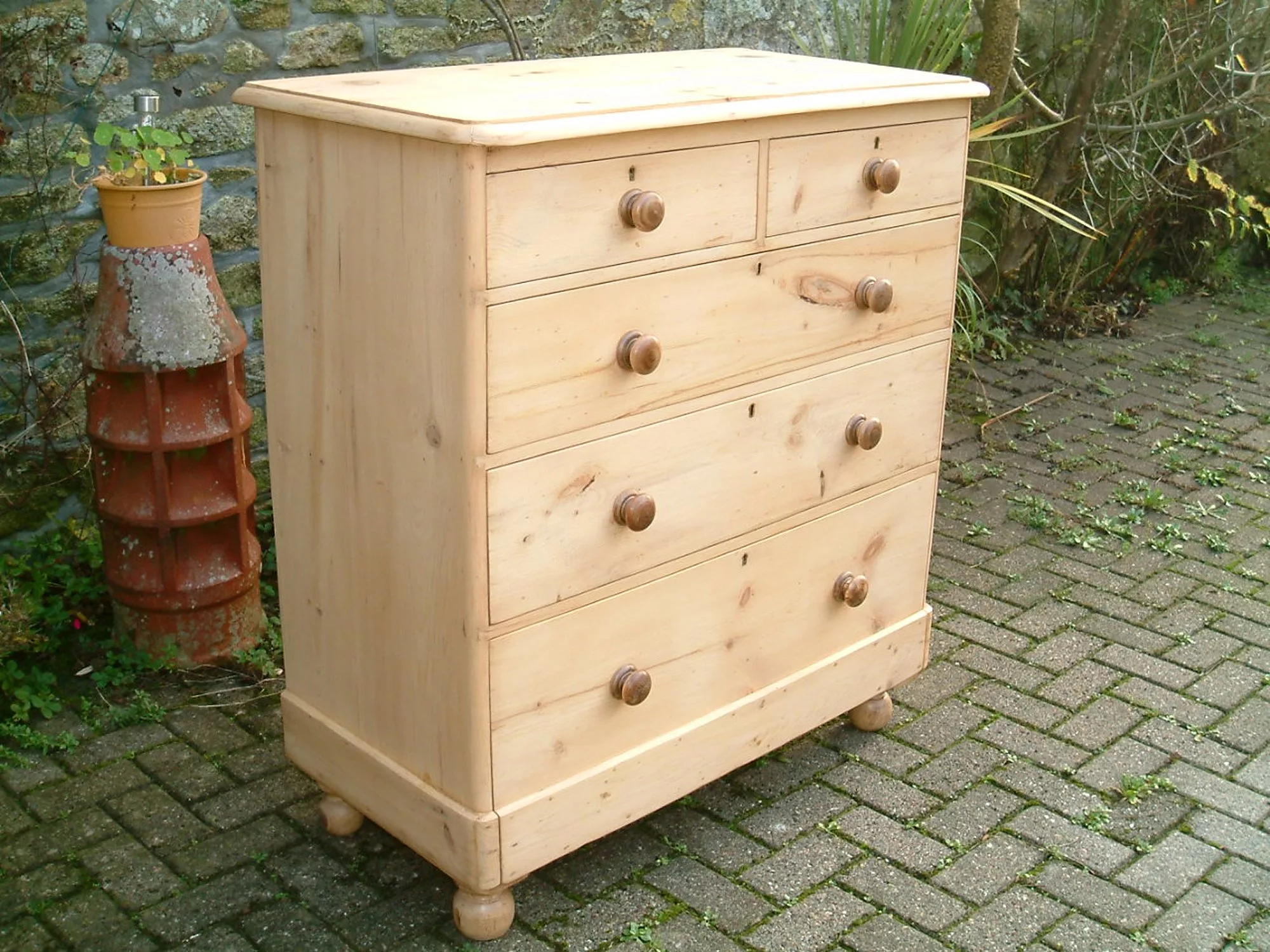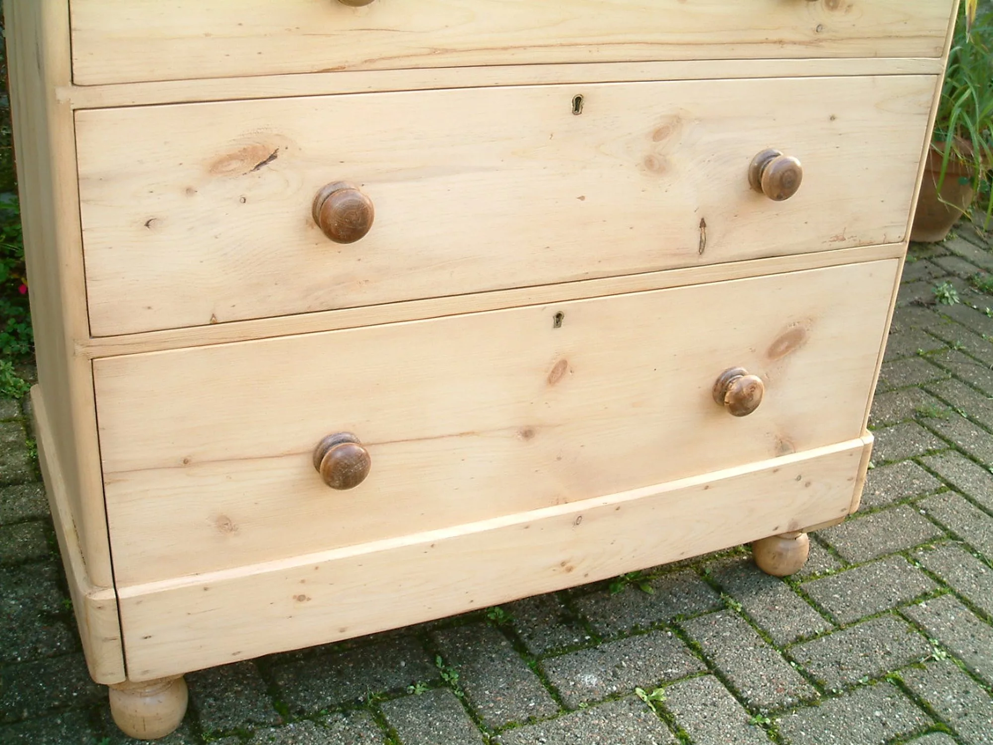 A beautiful, restored, Mid Victorian pine chest on shaped ball feet and plinth surround. Drawer bearers and runners restored, so drawers glide easily in their recesses. The chest is fitted with a lower 14 1/8″ deep bonnet drawer, which incoporates the plinth.