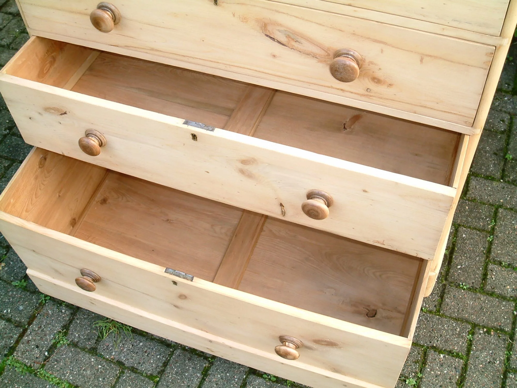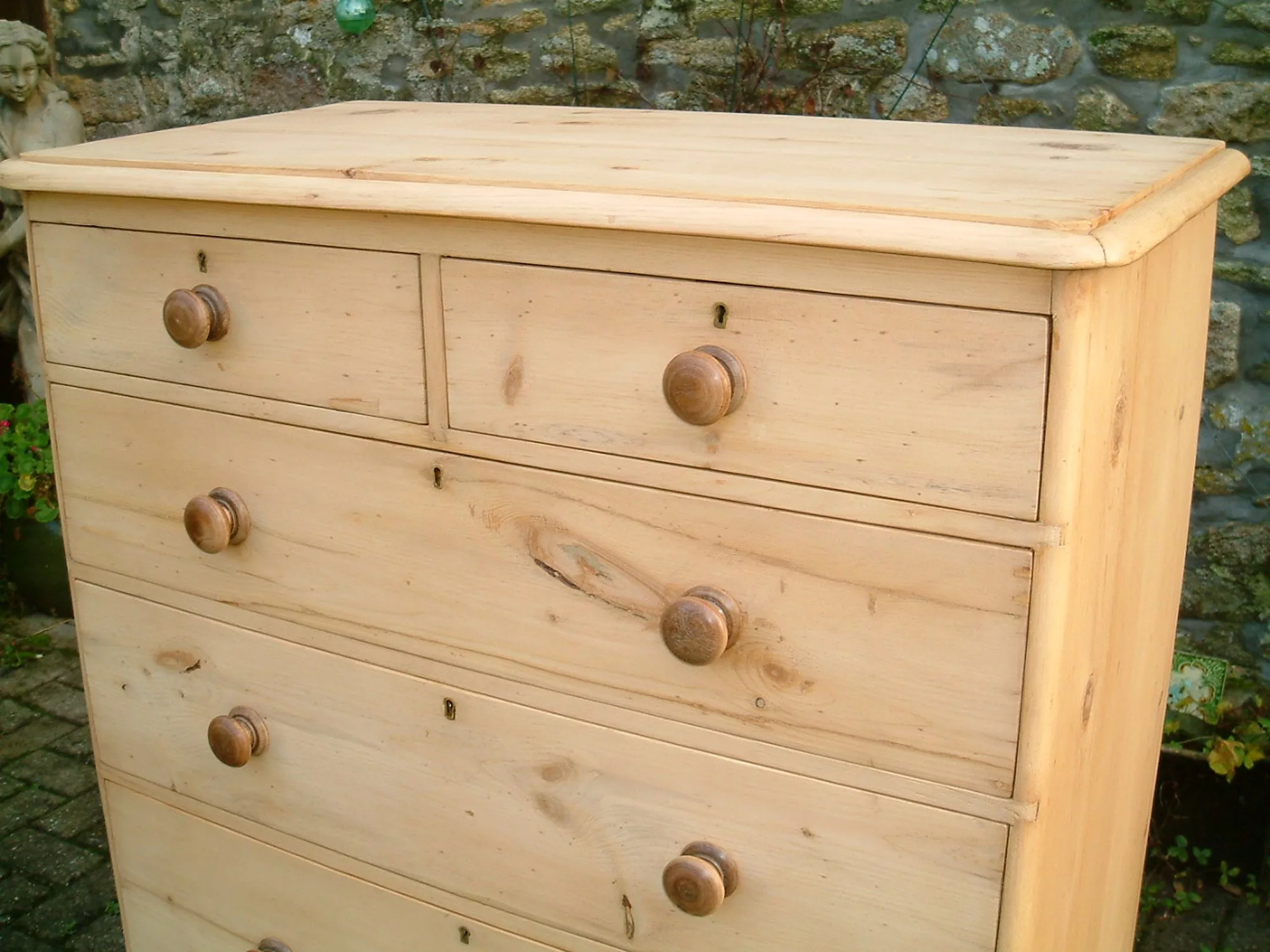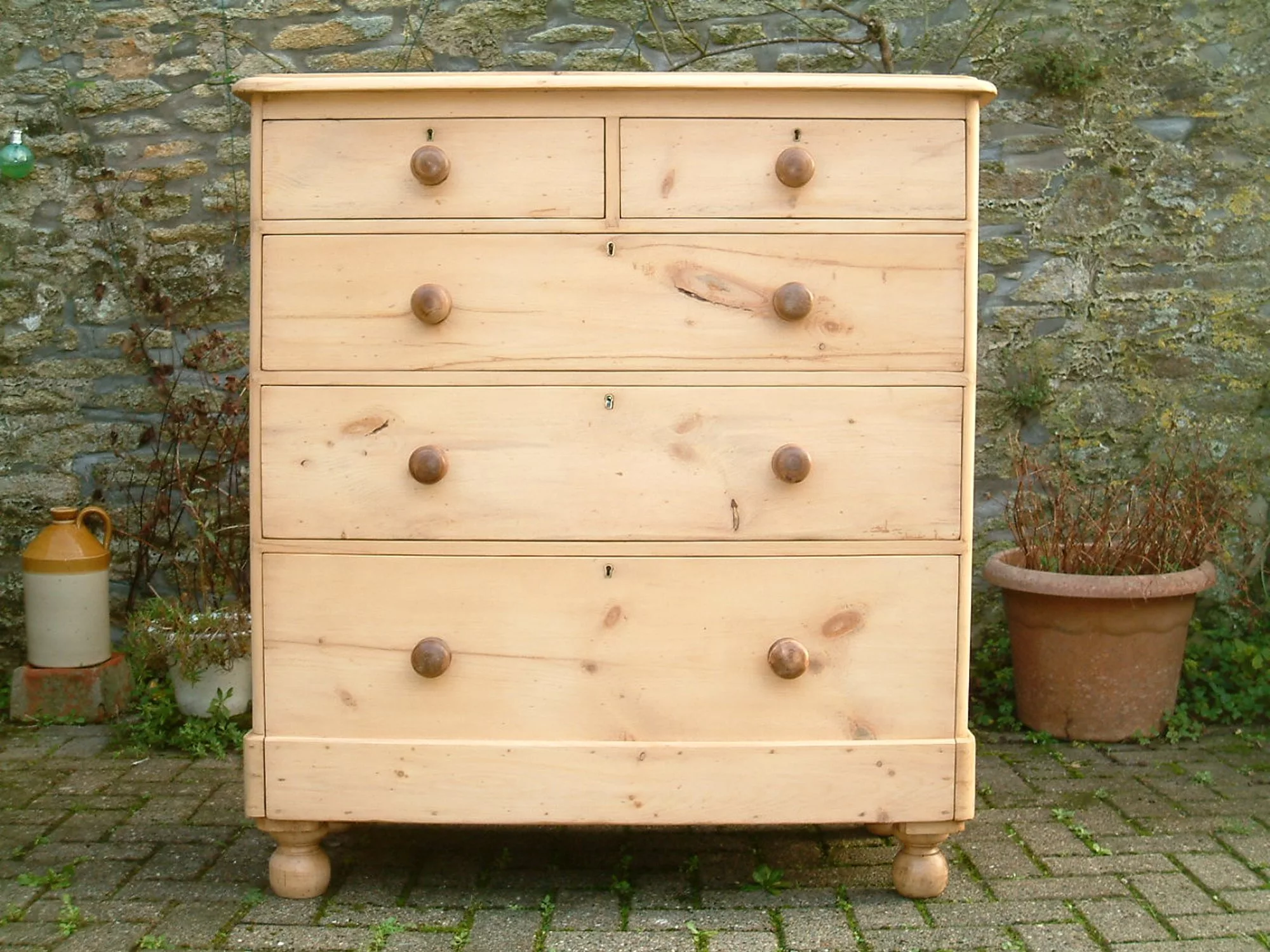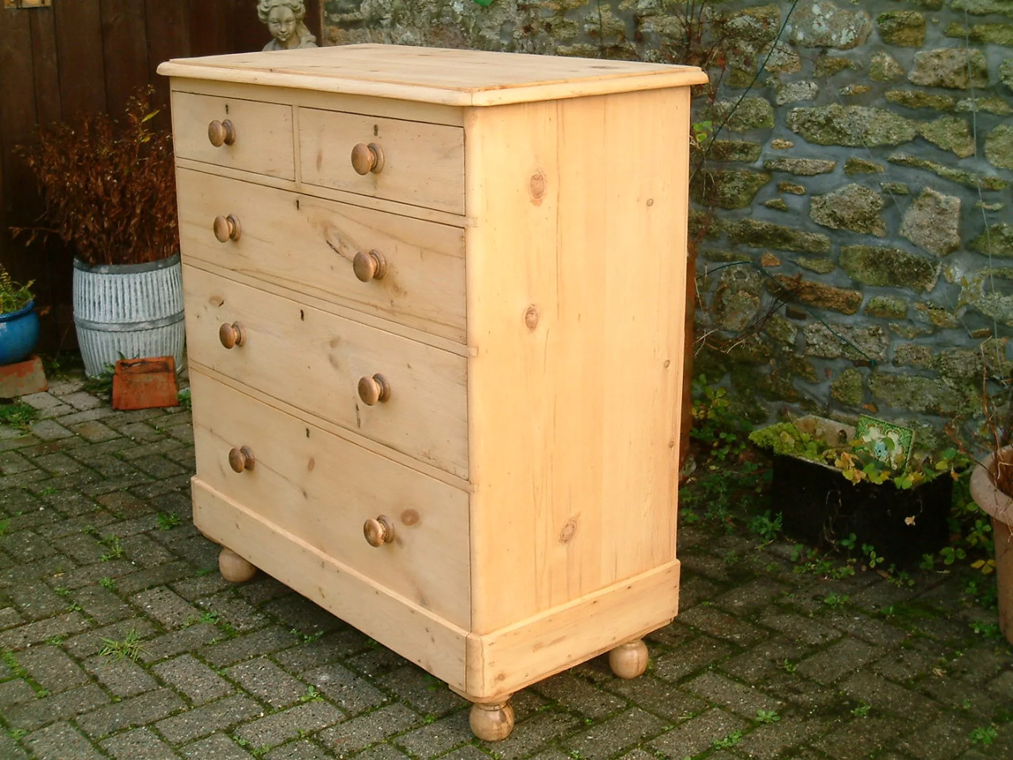 A beautiful, restored, Mid Victorian pine chest on shaped ball feet and plinth surround. Drawer bearers and runners restored, so drawers glide easily in their recesses. The chest is fitted with a lower 14 1/8″ deep bonnet drawer, which incoporates the plinth.