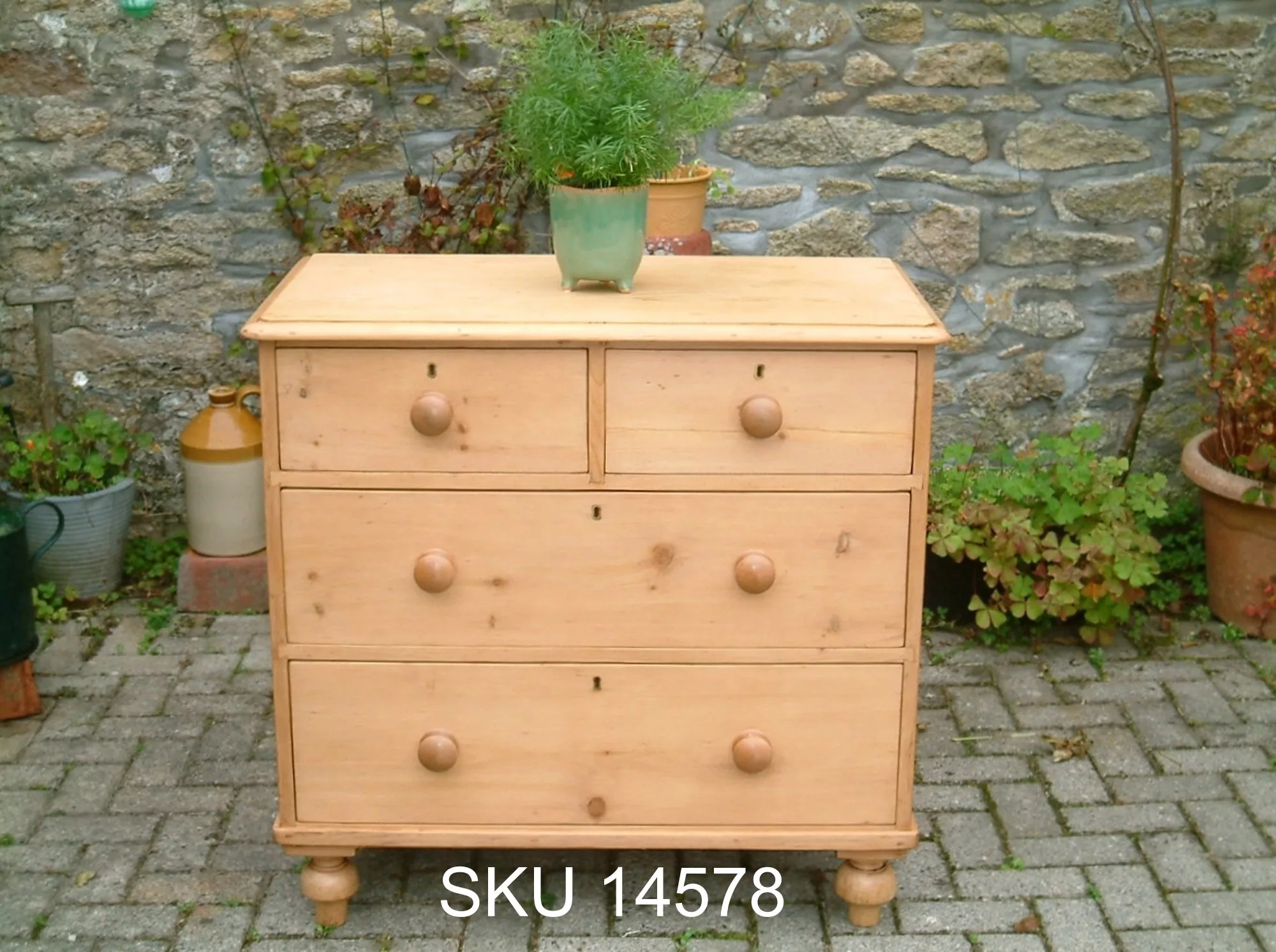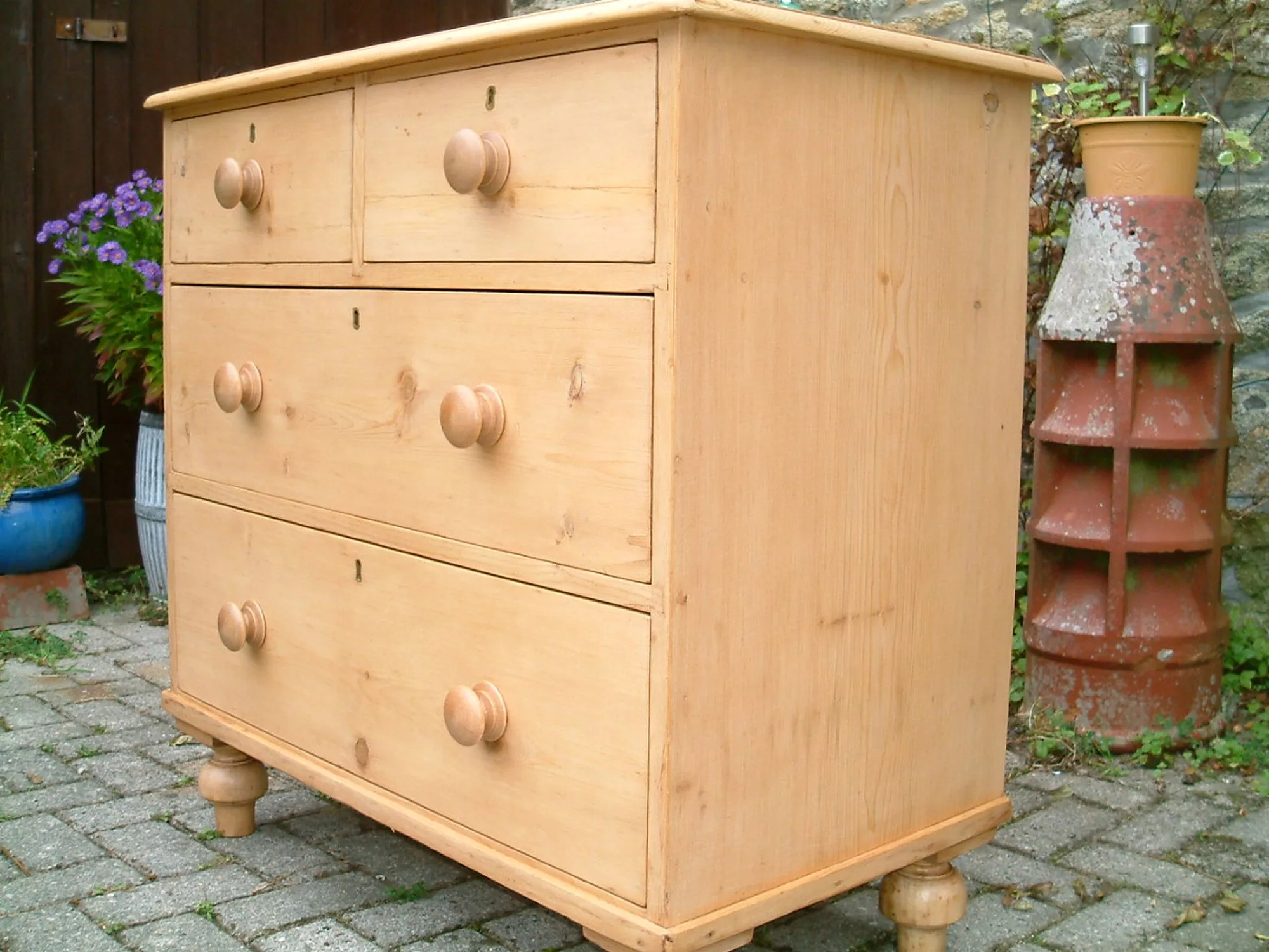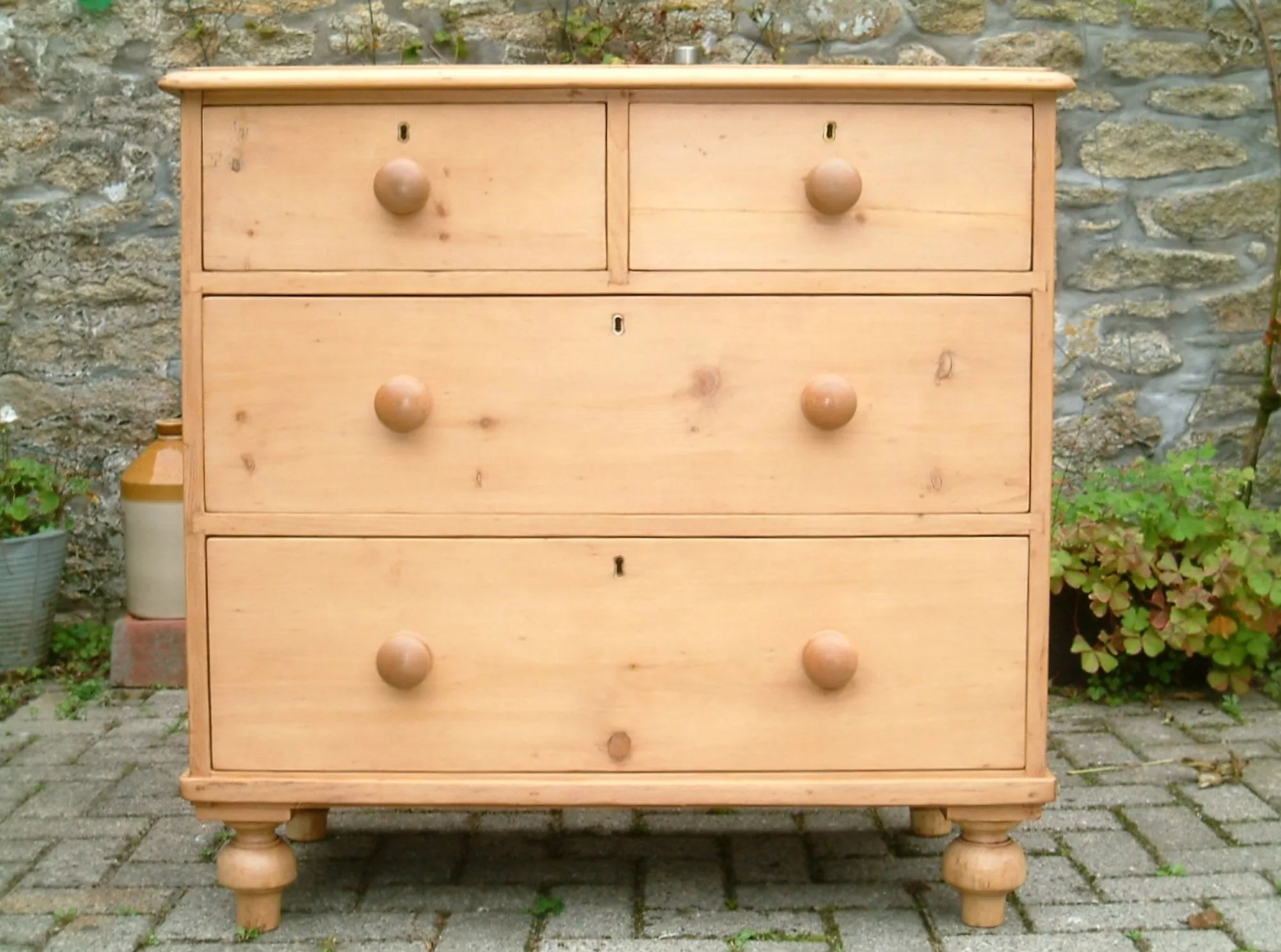 A fine, restored Victorian pine chest of drawers, on large tulip, turned feet. A very sturdy, clean chest, with large storage capacity, as drawers are deep front to back. Restored runner bearers and runners, so drawers glide easily in their recesses.