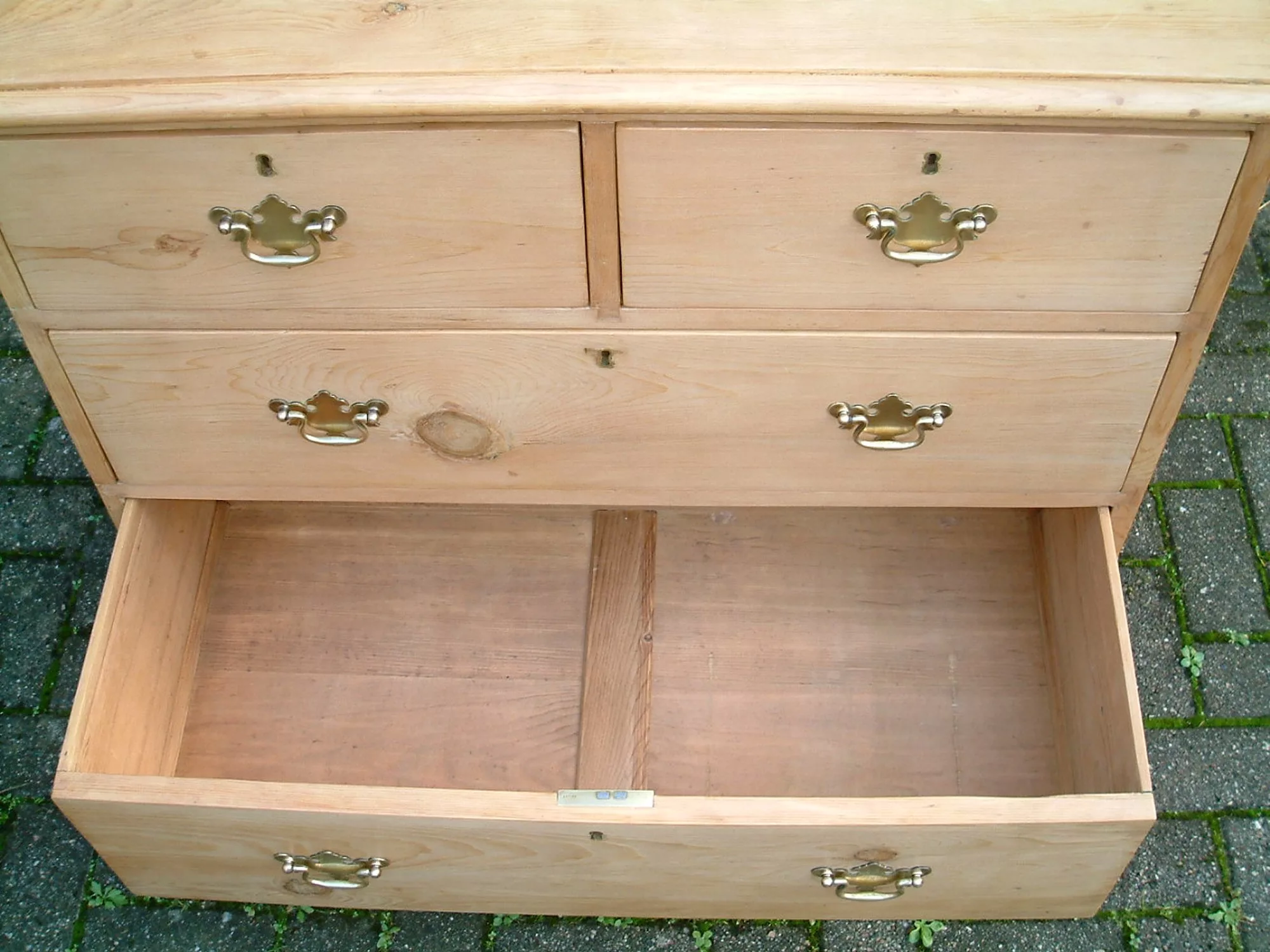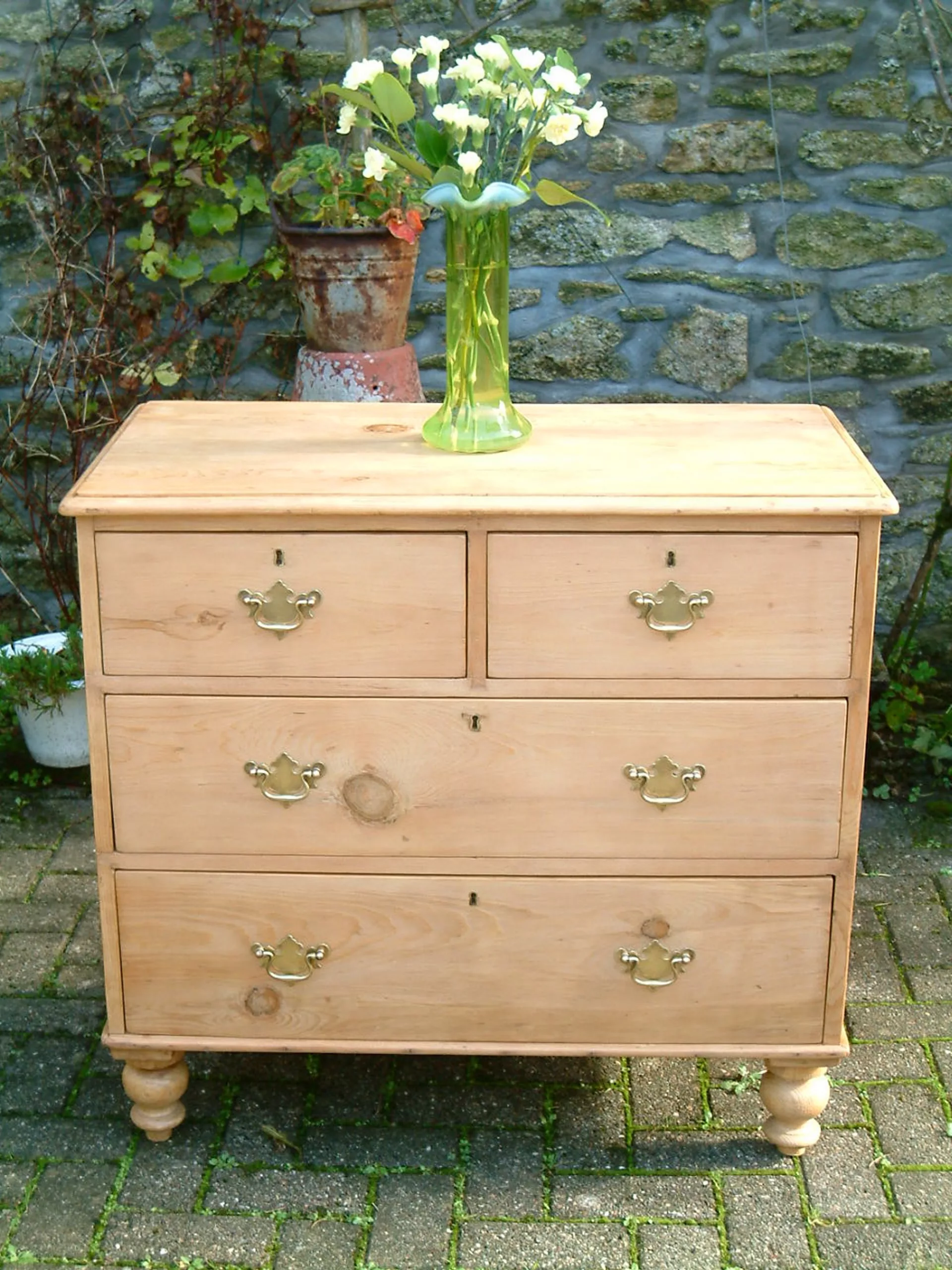 A lovely, restored, Victorian pine chest of drawers on fine turned supports, circa 1870. Drawer runner bearers and runners replaced where necessary, so drawers glide easily in their recesses. Drawers with all round dovetailed construction and timber bases. Original escutcheons. Some old shrinkage splits to the top, which have been filled. Sturdy construction. Fine panelled back. Wax finish. A very nice looking, light in colour, old pine chest.